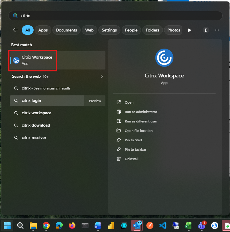- If you do not have the 'Citrix Workspace' software downloaded, download from https://www.citrix.com/downloads/workspace-app/.