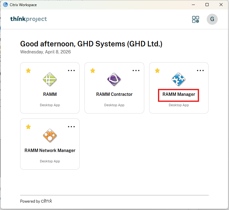 Entering the username and password in the Citrix Workspace sign in window. - Click to open "RAMM Manager".