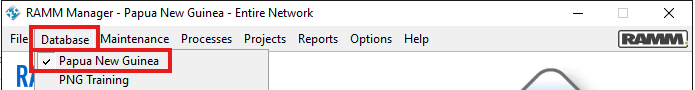Opening RAMM Manager in the Citrix Workspace software - Confirm the correct database is selected (Papua New Guinea).