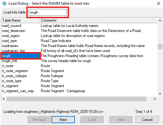 Loading the processed roughness data file in the Load dialog window - In the blank search bar at the top, type in "rough". Click the ‘rough’ row in the list of tables, and click Next.